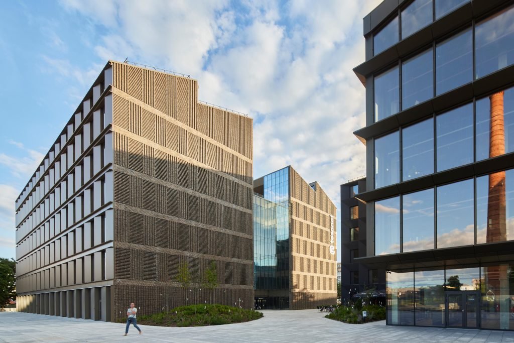 Pastatų fasadams pirmą kartą Lietuvoje buvo panaudoti gamykloje pagaminti trisluoksnio surenkamojo gelžbetonio elementai su klinkerio plytų apdaila. Šis sprendimas ne tik energetiškai efektyvus ir ilgaamžis, bet ir tausojantis aplinką, nes leido sumažinti galutinį atliekų kiekį, kuris susidaro liejant betoną įprastais būdais.