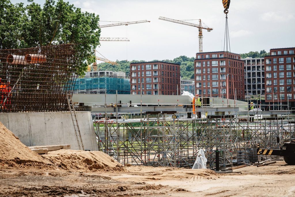 Šiuo metu tęsiamas krantinių atramų betonavimas bei pastolių, skirtų perdangai atremti, montavimas.