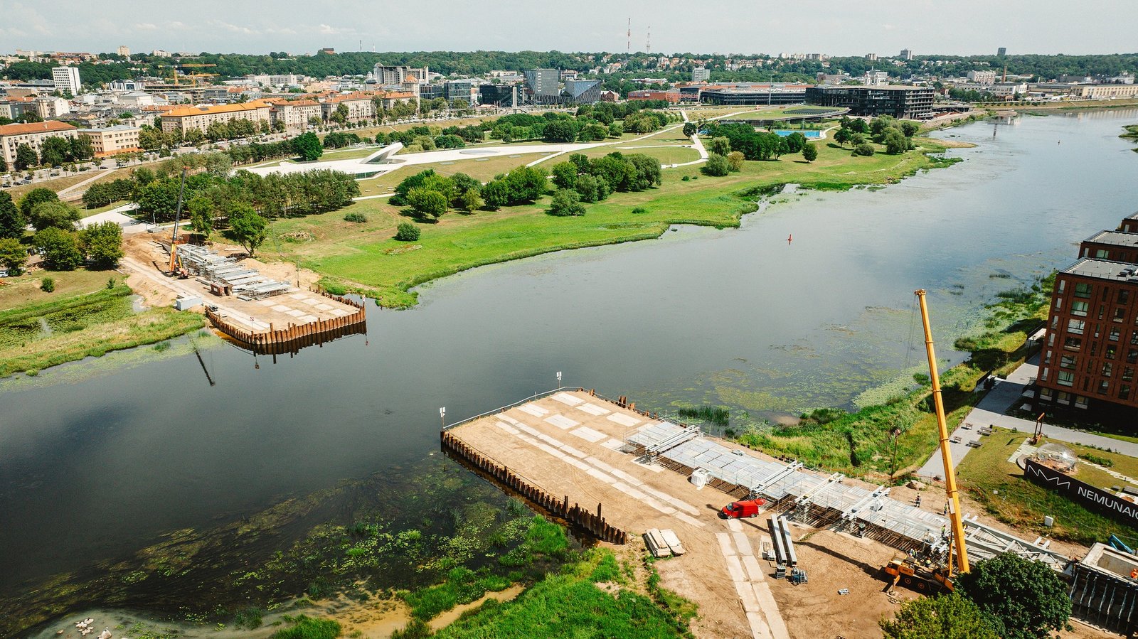 Pėsčiųjų ir dviratininkų tilto iš Žemosios Fredos į Nemuno salą statybos vyksta pagal planą, skelbia Kauno miesto savivaldybė ir dalijasi nuotraukomis iš statybų aikštelės.