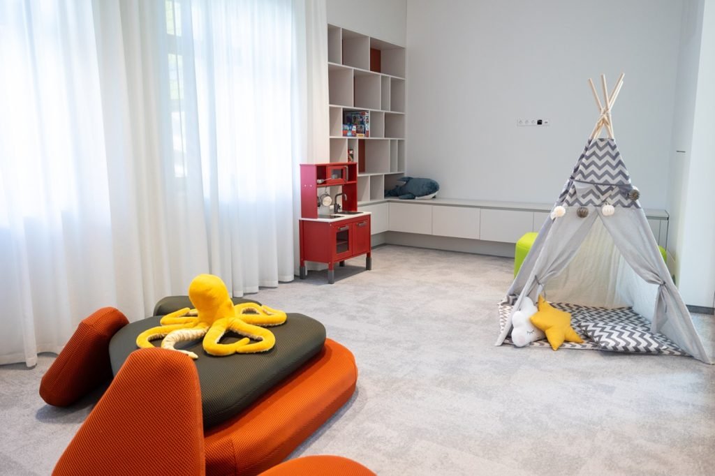 Atnaujintoje daugiau kaip 2000 kv. m ploto pastato dalyje, pirmame aukšte, taip pat įrengti 6 ergonomiški susitikimų kambariai ir vaikų žaidimų kambarys darbuotojų atžaloms.