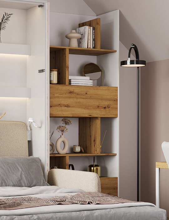 Didesniam erdvės funkcionalumui, anot jos, parankios ir sieninės lovos su lentynomis ir sofa. Tai funkcionalus baldas, kuris dieną patogiai naudojamos atsisėdimui, knygų ar dekoro elementų susidėjimui, o nakčiai vienu mygtuko paspaudimu tampa komfortiška miego erdve. „Toks baldas tinkamas ir vaiko kambariui, kurio dydis siekia iki 10 kv. m., ir atostogų būstui, kai visa ilsėtis atvykusi šeima gali kokybiškai išsimiegoti“, – akcentuoja „Gintaro baldai“ interjero dizainerė.