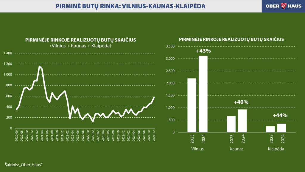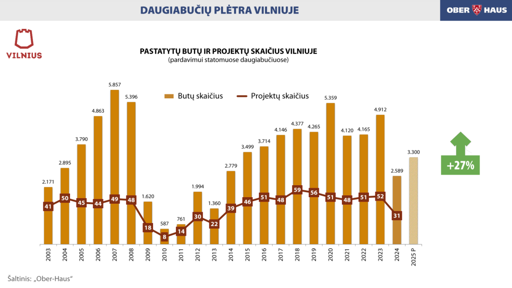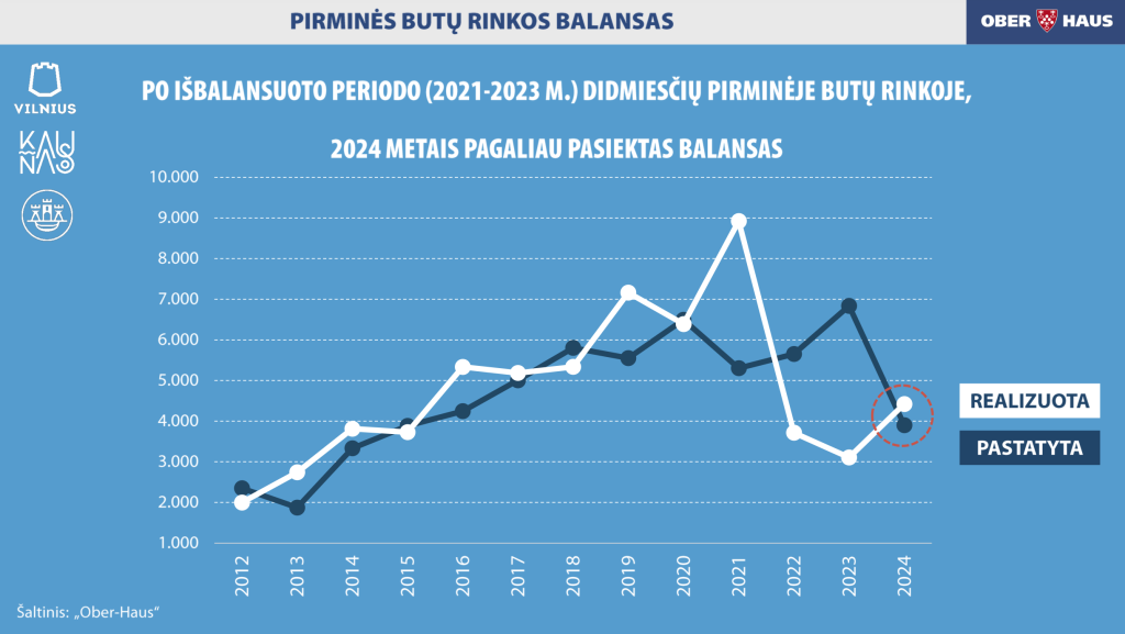 „Ober-Haus“ skaičiavimais, pagal esamus pardavimų tempus Vilniaus pirminėje rinkoje 2025 metais galėtų būti realizuota apie 4.400 butų, o pastatyta apie 3.300. Vadinasi, iki idealaus paklausos ir pasiūlos balanso gali pritrūkti apie 1.100 butų.